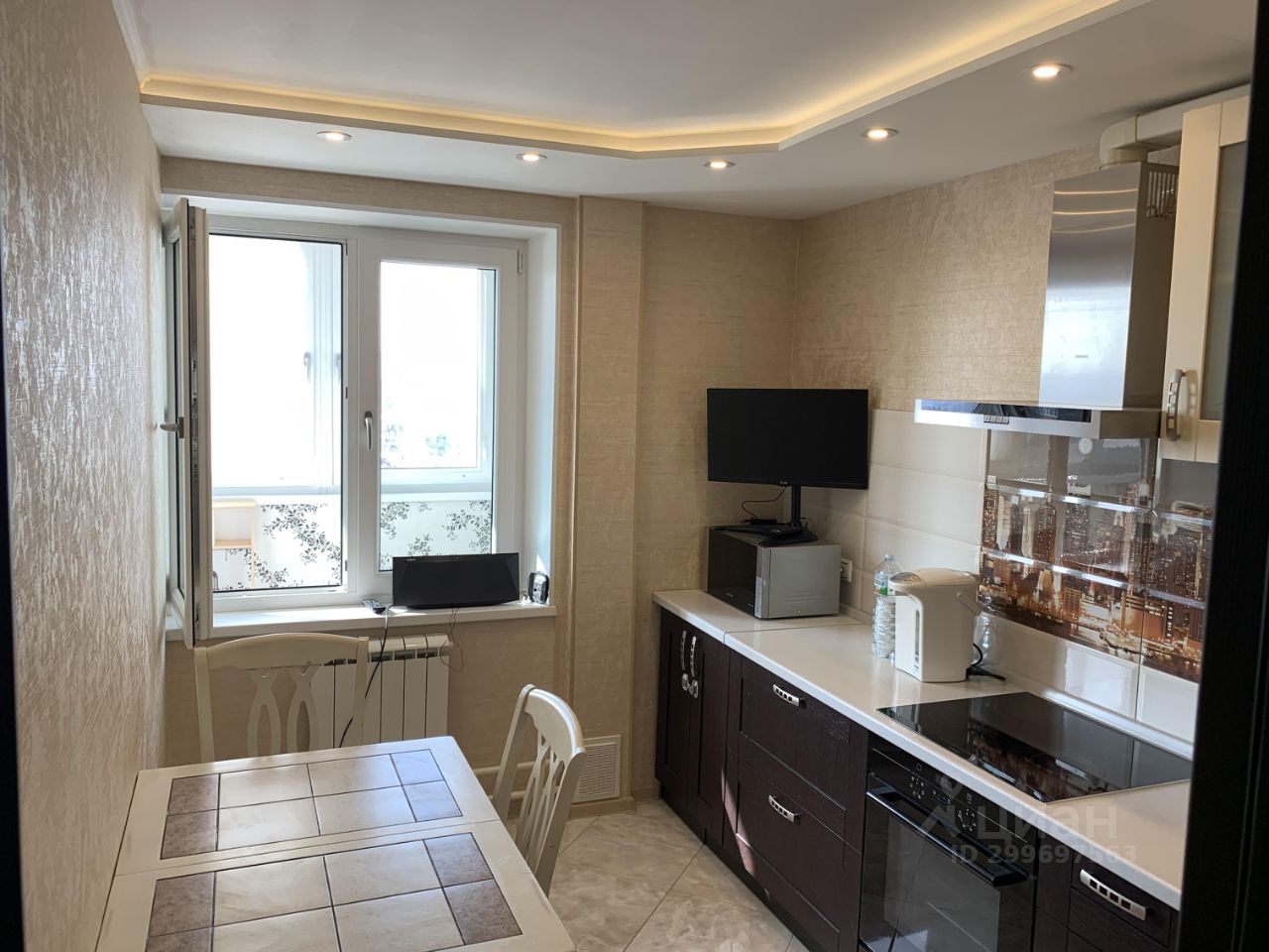В комнате монтированы крепления под большой телевизор 40-60 дюймов, а так же акустические розетки с возможностью установки тыловых колонок по бокам дивана для домашнего кинотеатра.