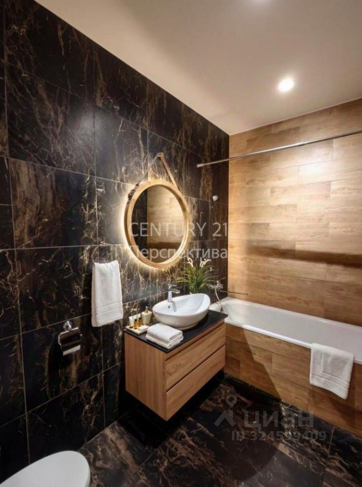 - Совмещенный сан.узел с ванной. Плитка пол и стены. Светильники и зеркало оформлены в массиве дуба. Установлены счетчики;