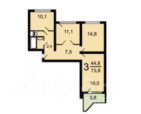 - изолированные комнаты 18,0 кв.м. (с выходом на застекленную лоджию 3,8 кв.м.), 14,8 кв.м., 11,1 кв.м.